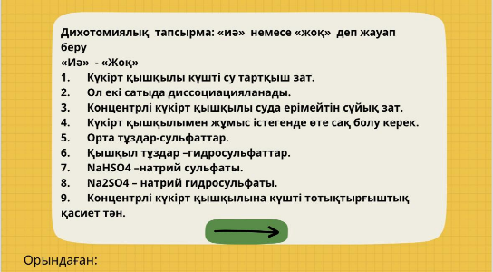 Оқушылар сөйлемді толықтырады. Күкірт сары қатты кристалды зат. Теріге немесе матаға тиген күкірт қышқылын тездетіп сумен жуып, содан соң ас содасымен ерітіндісімен шаю қажет. Күкірт қышқылы – күшті су тартқыш зат. |