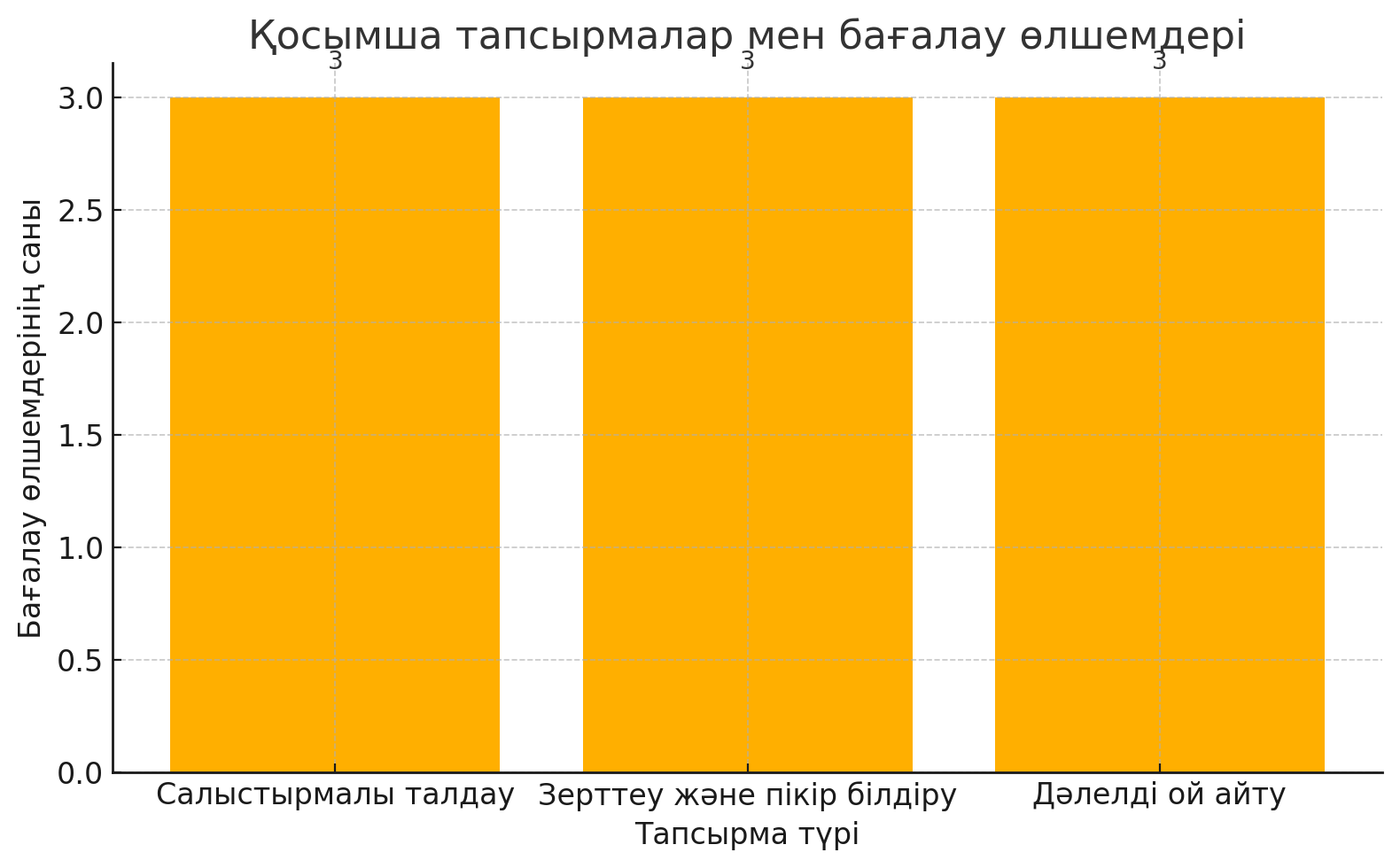 Диаграммада әр қосымша тапсырмаға сәйкес бағалау өлшемдерінің саны көрсетілген. Барлық тапсырмада 3 өлшемнен бар екенін визуалды түрде көруге болады.