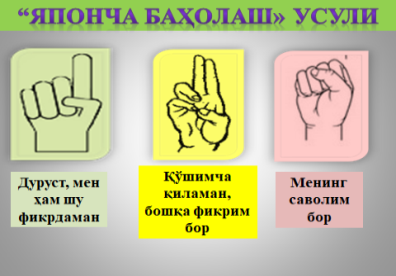 Қолиплаштирувчи баҳолаш: “Бошбармоқ” усули орқали ўзини-ўзи баҳолаш амалга оширилади Ўзаро бир-бирини баҳолаш “Японча баҳолаш” усули |