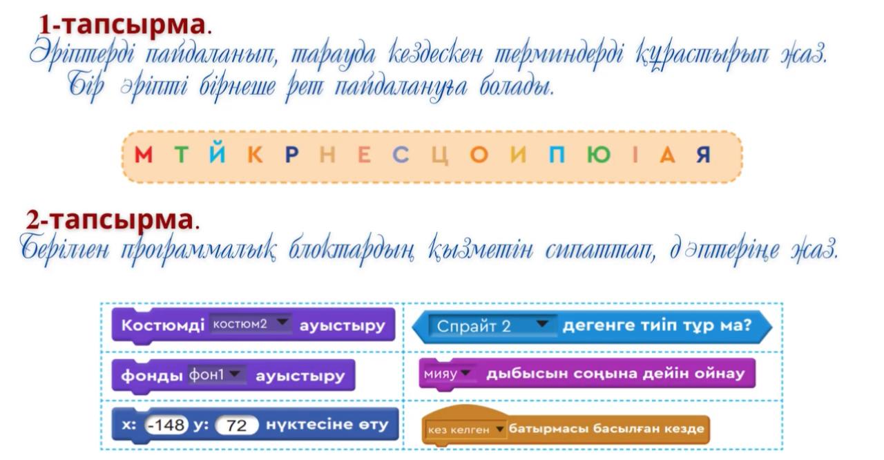 - интерактивті тапсырманы орындайды спрайттарды қосады. спрайттарға скирпт құрастырады |