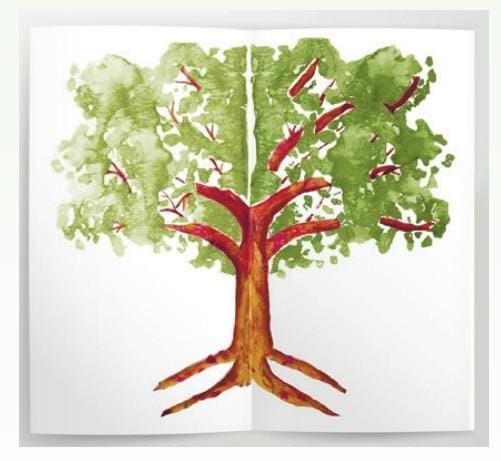 Үйде тәжірибе жасау арқылы монотипия тәсілін зерделе. Мұғалім ұсынған бейнематериалға мұқият қара. Онда көрсетілген бояу түстеріне назар аудар. Түстермен тәжірибе жаса. Күзгі табиғаттың суретін әртүрлі сызықтармен толықтырып сал. Монотипия тәсілін қолдан. Жай қарындаш, акварель, гуашь, қылқалам, су құятын ыдысты дайында. Керекті құрал-жабдықтарды орнына дұрыстап орналастыр. Сызық түрлерін анықта. Алдымен қағаз парағын екіге бүкте. Оны ашып, бір жағына жарты ағаштың суретін сал. Енді қағазды қайтадан бүктеп, суретті парақтың таза жағына бастыр. Міне, ағаштың монотипия тәсілі- мен салынған |