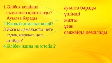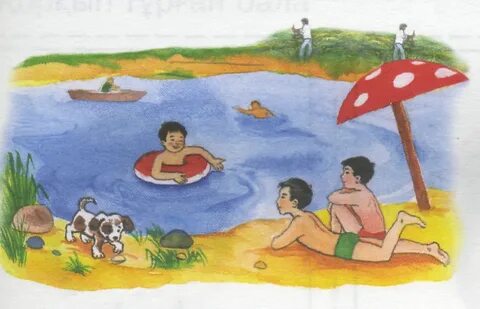 Тыңдалым Жаз келді жадырап, Жазда апамның аулына Барып едім қыдырып. Бір қошақан алдымнан Ойнап шықты жүгіріп. Аудио жазып, Whatsapp-қа тірке. А) Мәтін кім немесе не туралы? Батыр туралы Жазушы туралы Балуан туралы Демалыс туралы Айтылым Суретті пайдаланып әңгіме құра. Сурет бойынша бірнеше сұрақ дайында. *Демалыс қандай болады? Айтылым Оқы, қайтала: Кім қайда демалады? Мен шипажайда демаламын. Сен ауылда демаласың. Сіз тауда демаласыз. Ол өзенде демалады. |