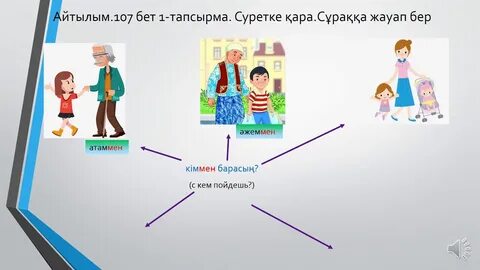 Айтылым Оқушыларға қиылған қағаздар беріледі. Сол сөздерді мағынасына қарай біріктіру арқылы топтарға бірігеді. (Оқушылардың ойлау белсенділігі ескеріледі.) Әрбір мақал-мәтелдің тақырыбы және олардың бір-бірімен байланысы слайд арқылы көрсетіледі. Айтылым Грамматикалық қоржын Жіктік жалғауды қайтала. Мұғалім сөздің басын дауыстап айтады, кез-келген оқушы жалғауын жалғастырады. Оқушы қателессе, қасында отырған көршісі түзетеді. Оқылым Айтылым. Оқы. Қайтала Сергіту сәті Оқылым Айтылым Қосымша тапсырма Оқушы қажеттіктеріне қарай қолдау көрсетіп, қосымша түсіндіреді ЕББҚ (Зейін тапшылығы және гипербелсенділік синдромы (ЗТГС) жеке қолдау көрсетіледі Тыңдалым 1 – тапсырма. Мәтінді тыңда. Сұраққа жауап бер