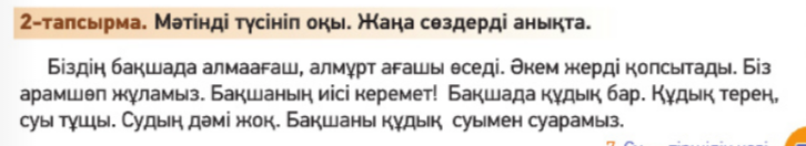 Айтылым тапсырма Жеке жұмыс ЕББҚ:(Зейін тапшылығы және гипербелсенділік синдромы (ЗТГС) (даралап оқыту тәсілі арқылы) Тапсырма орындауда «Аяқталмаған сөйлем» әдісі қолданылады. Жеке қажеттілгі бар оқушы (төмен деңгейлі)«қолдау» әдісі арқылы саралау жүргізіледі. Оқылым 1-тапсырма Оқы. Сұрақтарға жауап бер.