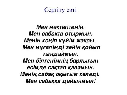 Тыңда. Оқылым Айтылым Сергіту сәті Тыңдалым Айтылым 1- тапсырма Мәтінді тыңдап, қайтала Оқылым 2-тапсырма Мәтінді оқы. Сұрақтарға жауап бер. Айтылым Қосымша тапсырма Оқушыларға мектепке қатысты сөздер айтуға еркіндік беріледі. Оқушы қажеттіктеріне қарай қолдау көрсетіп, қосымша түсіндіреді ЕББҚ (Зейін тапшылығы және гипербелсенділік синдромы (ЗТГС) жеке қолдау көрсетіледі Жазылым 3-тапсырма Көп нүктенің орнына қажетті сөздерді қойып жаз. Айтылым 4-тапсырма Сурет бойынша диалог құрыңдар 5-тапсырма Жазылым |
