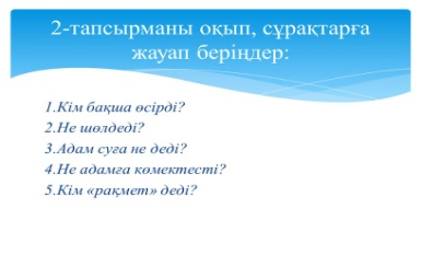 2- тапсырма Айтылым Жеке жұмыс Мәтінді оқы. Сұрақтарға жауап бер.
