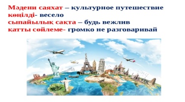 Айтылым Біз сыныппен мәдени саяхатқа шығамыз. Демалыста мұражайға, театрға, саябақтарға барамыз. Біздің сынып көңілді. Апай бізге: «Мұражайда, театрда қатты сөйлемеңдер! Қатты күлмеңдер! Сыпайы болыңдар!»- дейді. Біз тазалық сақтаймыз. Қоқыс тастамаймыз. Апай бізге: «Жарайсыңдар!»- дейді. Мәтін бойынша сұрақтарға жауап беріңдер