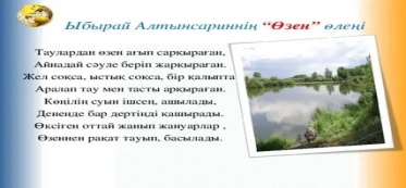 Тыңдалым,айтылым. Өзен- река Дәмді-вкусный Асты-снизу, под Көлшік-небольшое озеро Айналады-превращается Айтылым Ойтүрткі «Он сұрақ» стратегиясы Мұғалім бір оқушыны таңдап алады және оның маңдайына негізгі сөз жазылған стикерді жапсырады – қатысушы сыныпқа 10 сұрақ қоя алады, оған жауап не ИӘ, не ЖОҚ деп беріледі. «Өзен» сөзі шығады. Көмек қажет жағдайда мұғалім өзі жетелеуші сұрақтар қояды. – Өзен не үшін қажет? Мектептегі өмір қызық па? Оқиық Өзен/ өзеннің түбі