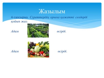 Жазылым 1.Адам (гүл,бақша) өсірді. Бақша (айтты, шөлдеді). 3.Су бақшаны (көрді, суарды). 4. Су адамға (көмектесті, айтты) Айтылым Адам не өсірді?