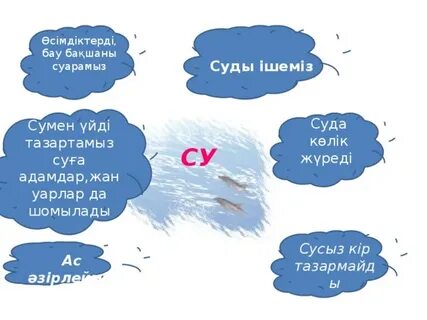 Сергіту сәтін орындайды. "Сыныпта кім бар?" ойыны. Мақсаты: Оқушылардың шапшаң, жылдам қозғалып, есту қабілеттерін, бірін - бірі сезу қабілетерін дамыту. Жүргізілуі: Сыныпта 2 оқушы бар деп айтылған 2 оқушы ғана орынынан тұрады. Егерде сыныпта ешкім жоқ деп айтсам, оқушылар парта астына кіреді. Оқиық Сұрақтар: Жазайық Адамдар ... суың дәмді,- дейді? Адамдар Өзенге ... тастайды. Өзен ... ке айналады. Айтылым Синквей формасы (француз тілінен аударғанда) 5 - өлең жолды өлең құрастыру. Тақырыбы: "Су" 1 - жол - 1 сөз, зат есім немесе адамның аты 2 - жол - сипаттау - 2 сын есім 3 - жол - іс-әрекетті баяндау - 3 етістік 4 - жол - тақырыпқа сәйкес 4 сөз 5 - жол - қорынды 1 сөйлем Айтылым Әрекеттер: 1.Суың қандай дәмді!- дейді. 2.Рақмет!- дейді 3.Су береді Жазылым Су, пайдалы, ыстық, тазалық, ластамау,өзен, қоқыс тастамау, суару, көмектеседі. Оқылым Өзеннің суы дәмді. Адамдар Өзенге қоқыс тастайды. Өзеннің астына қоқыс жиналады. Өзен ренжиді. Ол көлшікке айналады. Айтылым