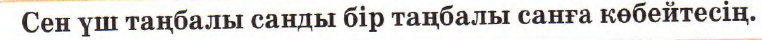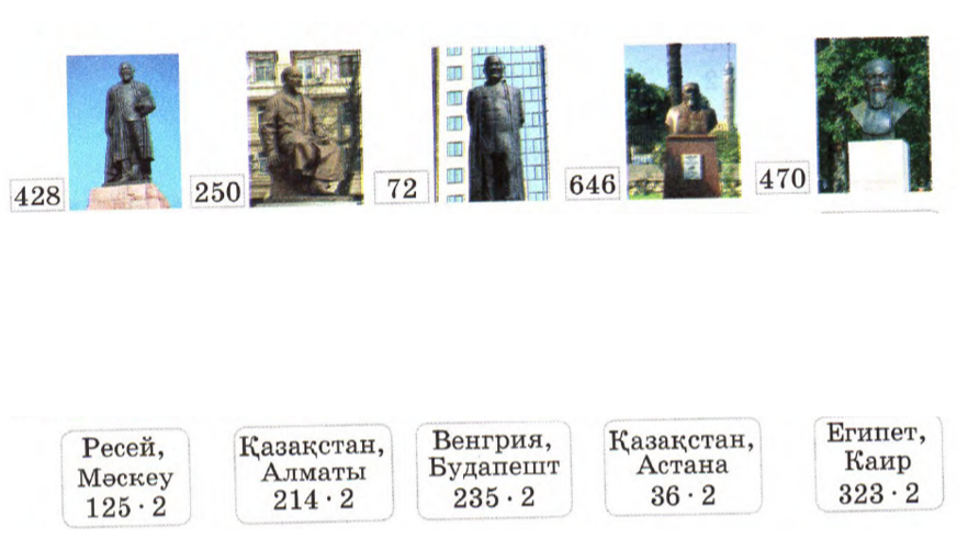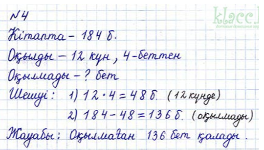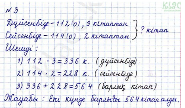 Разрядтан атамай үш таңбалы санды бір таңбалы санға жазбаша көбейту алгоритміне сәйкес амалдарды бағанға жаза отырып, үш таңбалы сандарды ауызша қосу мен азайтуды есептейді Оқушылар есептің шарттарынан қысқаша жазба жасайды, есепті екі амалмен шығарады, есепке өрнек құрып, жауабын жазады |