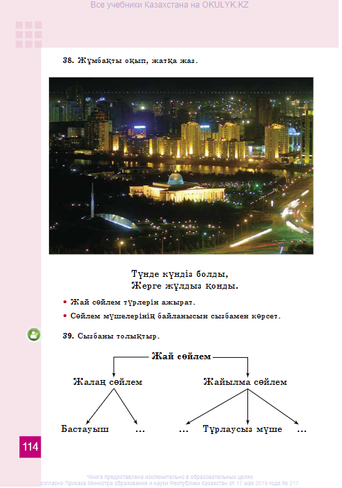 Өлеңді бірге айтады. Екі сөйлемді жазады және салысты-рады. Жұмбақ-ты жатқа жазады. Сөйлем мүшелері-нің байланы-сын сызады. Кері байланыс жасайды. |