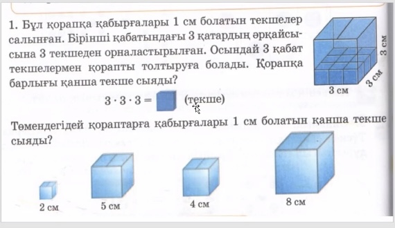 Балалар текшелерді қорапқа салып тәжірибелік жұмыс жасайды.Текшелерді суретте көрсетілгендей шетінен бастап қалап салу керек. 3х3 бұл текшен ің бір қырының саны .Ал мұндай қабаттан үшеу шықты .Онда 3х3х3=27 болады .Енді осы сияқты 2см,5см,4см ,8см Дескриптор: