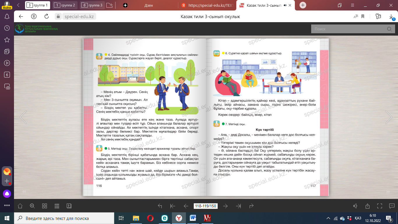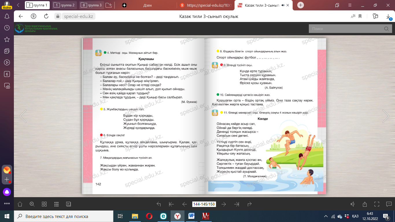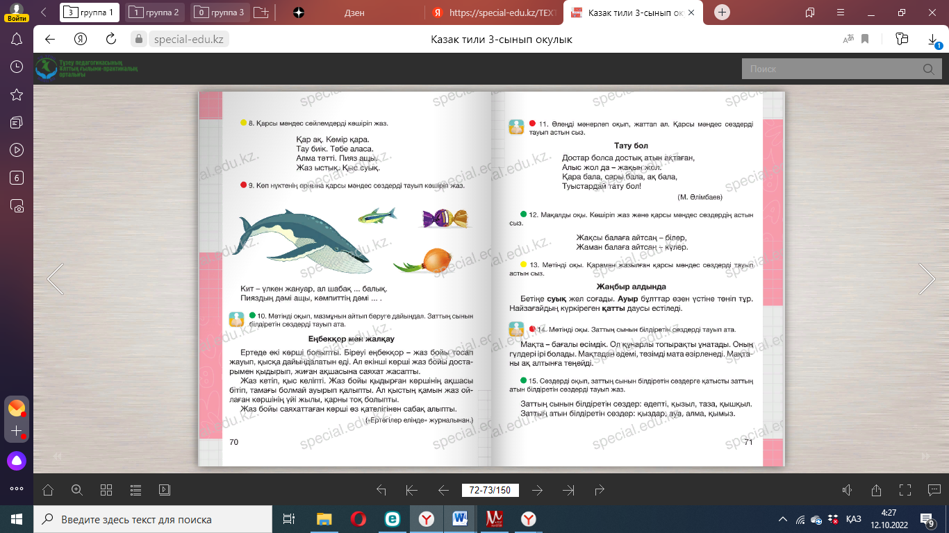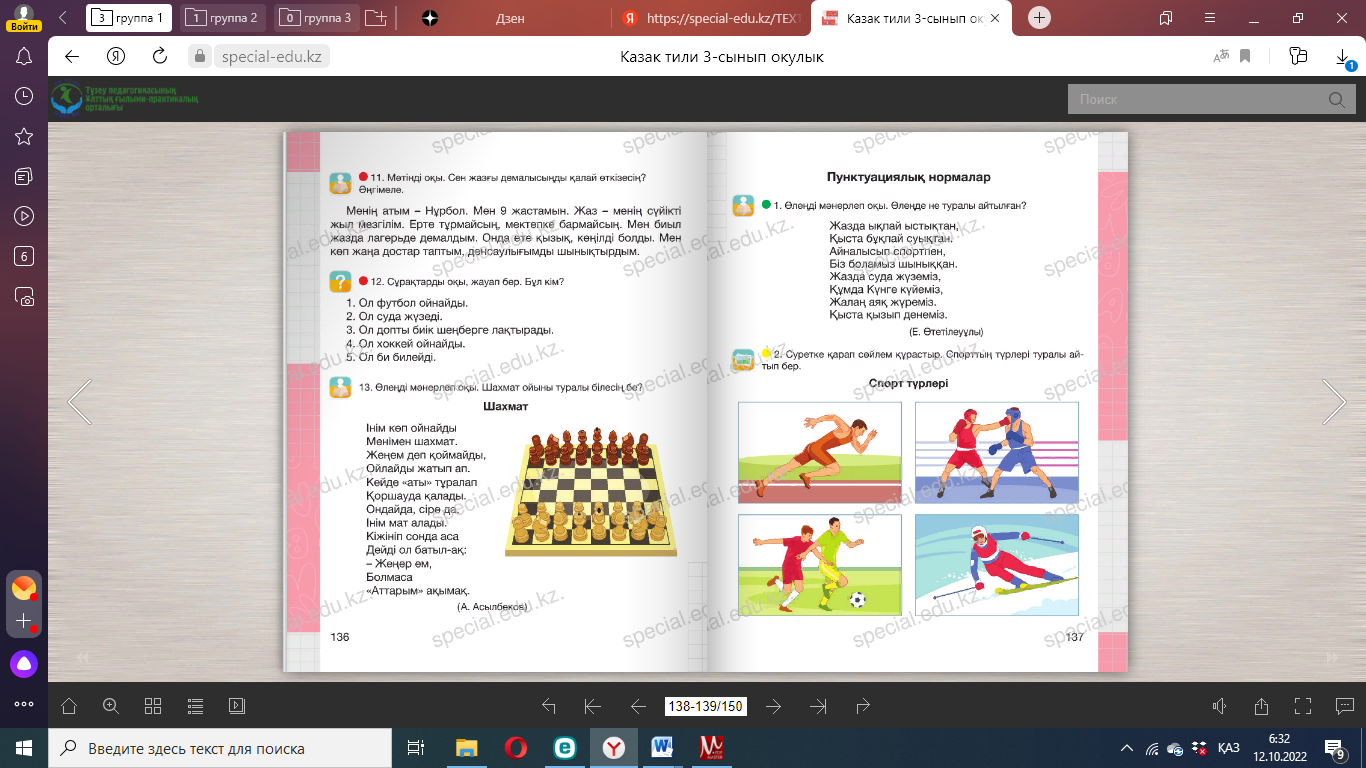 Оңға, оңға түзу тұр, Солға, солға түзу тұр. Артқа қарай бір адым Алдыға қарай бір адым Жоғары төмен қарайық Орнымызды табайық. Бөлім бойынша жиынтық бағалау №7 Жұмбақтардың шешуін тап. Боя. 1. Оңынан оқы – Тағаммын. Соңынан оқы – Тағаммын. 2. Бойы бір қарыс, Сақалы екі қарыс. 10. Мәтінді түсініп оқы. Мәтінге тақырып қойып көшіріп жаз. Оқу жылы аяқталып келеді. Мен ана тілі, математика, сурет пәндерін жақсы көремін. Әр пән ойлау қабілетімізді дамытады. Дұрыс жазып, сауатты сөйлеуге үйретеді. Сондықтан бар- лық пәнді жақсы оқимын. Менің болашақта танымал тігінші болғым келеді. ____________________________________________________________ Мәтінді мәнерлеп оқы. Сұрақтарға жауап бер: -Мәтін не туралы? Дескриптор: - Мәтінді оқиды. -Сұрақтарға жауап береді. -Сөздердің айтылуы мен жазылуын салыстырады. |