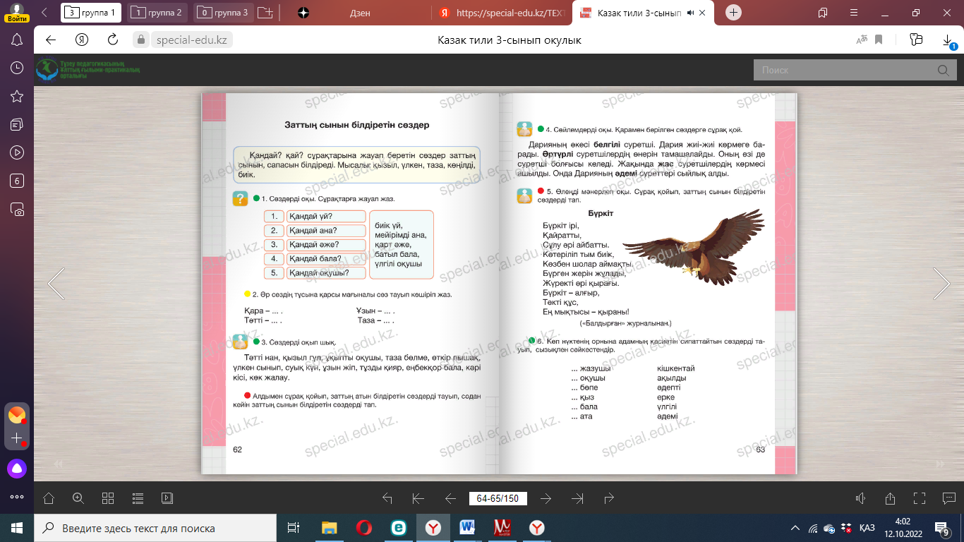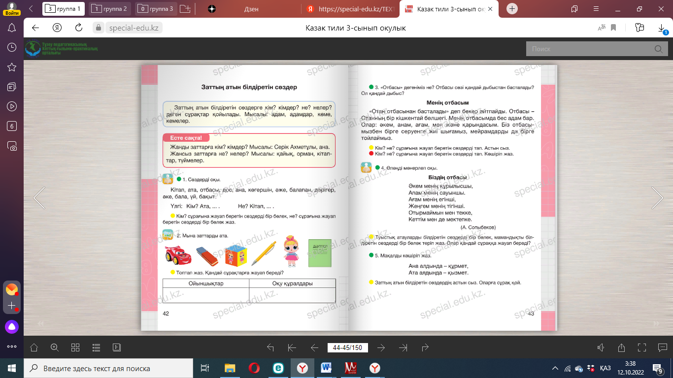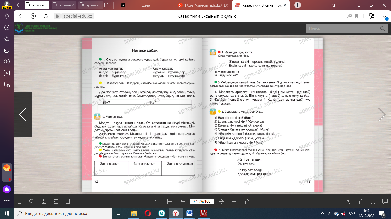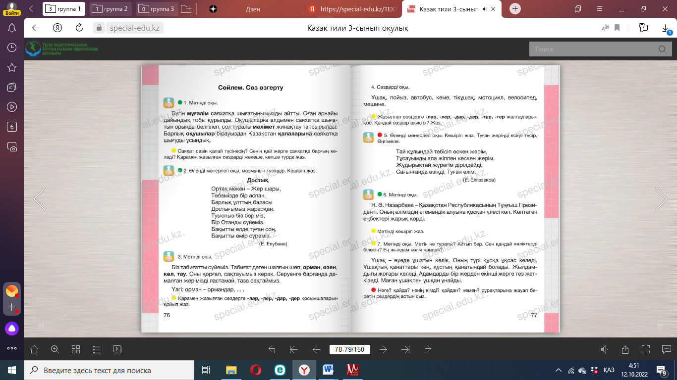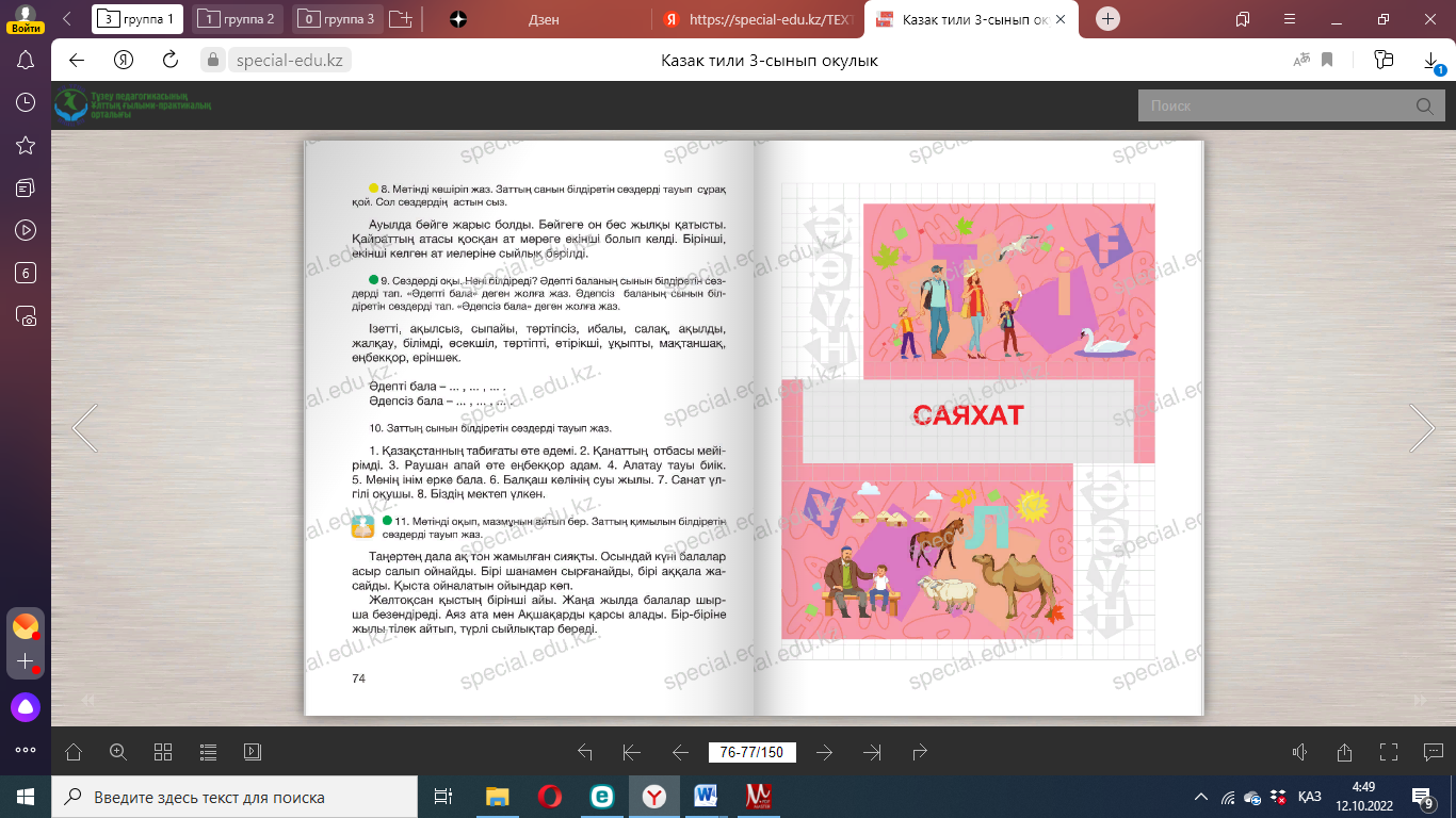 Сергіту сәті: Оңға, оңға түзу тұр, Солға, солға түзу тұр. Артқа қарай бір адым Алдыға қарай бір адым Жоғары төмен қарайық Орнымызды табайық. Дәптермен жұмыс. Байланыстырып сөйлеу. Диалог 1. Бесік жырын оқып, соңғы екі жолын көшіріп жаз. Тағы да екі жолды осы екі жолға ұйқастырып жаз. Бесік жыры Айналайын бота көзім, Мені өзіңдей уатар. Қайғы басса жұбатар. Ұйықта, жаным, әлди-ай, «Апалаған» әрбір сөзің Анаң көңілі болсын жай. (Қ. Мұқышев) ____________________________________________________________ 2. Керекті сөздерді қойып, сөйлемдерді көшіріп жаз. 1. Дүниеге келгеннен кейін ________ тойланады. 2. Тәй-тәй басқан кезде __________ өткізеді. 3. Мектепке барған балаға ________ жасайды. 4. Бала ержеткен кезде _________ өткізеді. Керекті сөздер: бесік той, тұсаукесер, тілашар, сүндет той. 3. Мен кіммін? деген сұраққа жауап бер. Отбасында Үлгі: Ата-анамның – ұлымын немесе қызымын Ата мен әжемнің ________________________________________ Әпкемнің _______________________________________________ Ағамның ________________________________________________ Інімнің __________________________________________________ Керекті сөздер: іні, қарындас, сіңлі, немере, бауыр. 4. Сұраққа жауап жаз. 1) Өзіңнің отбасыңда неше адам бар? ____________________ 2) Олар кімдер? _________________________________________ 3) Үйіңде отбасылық қандай дәстүр қалыптасқан? ____ 12-жаттығу. Мақалды көшіріп жаз. Аз сөйле, көп тыңда. Мағынасы қарама-қарсы сөздердің астын сыз. Сұрақтарға жауап беріңдер. . |