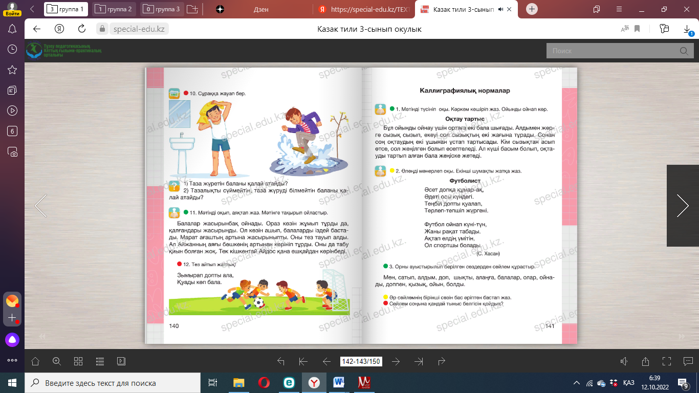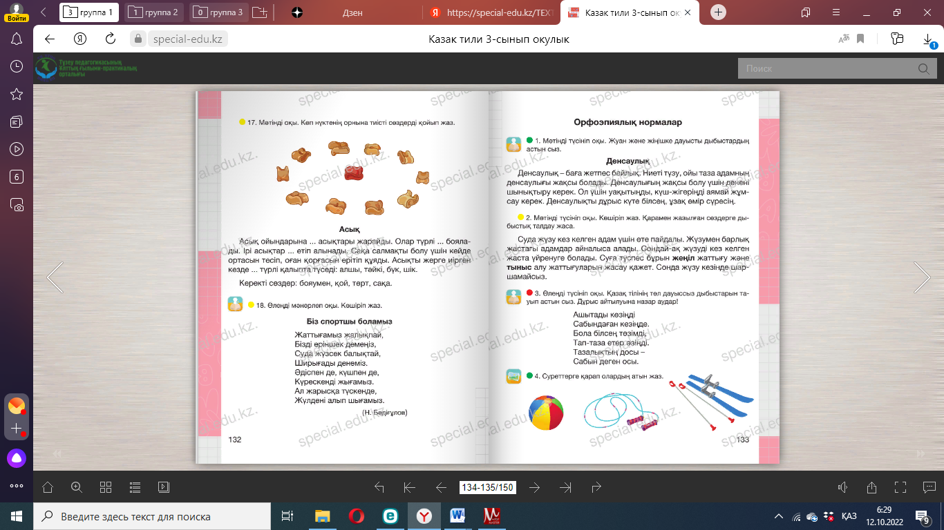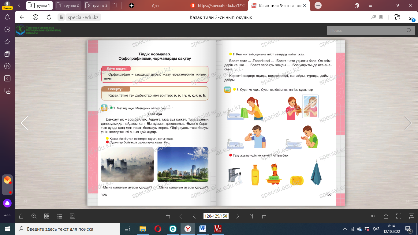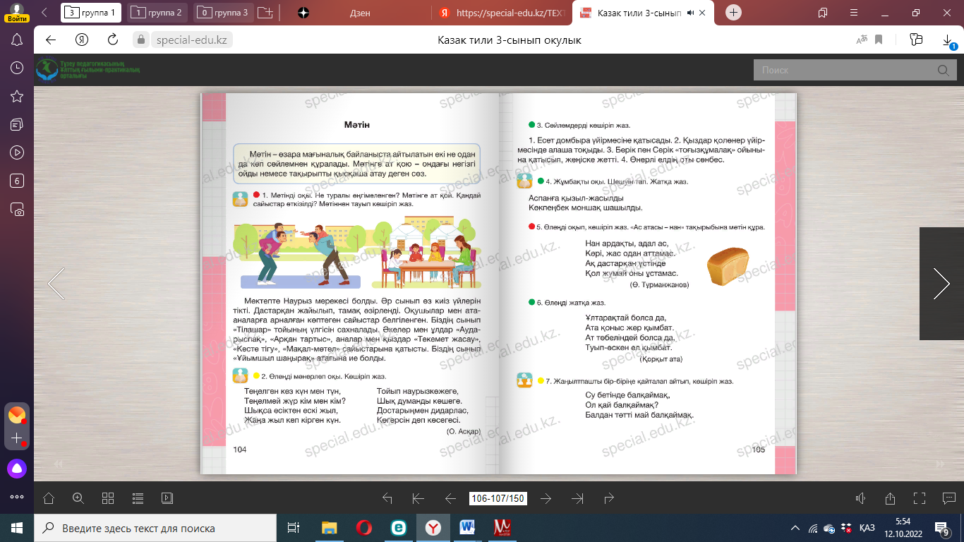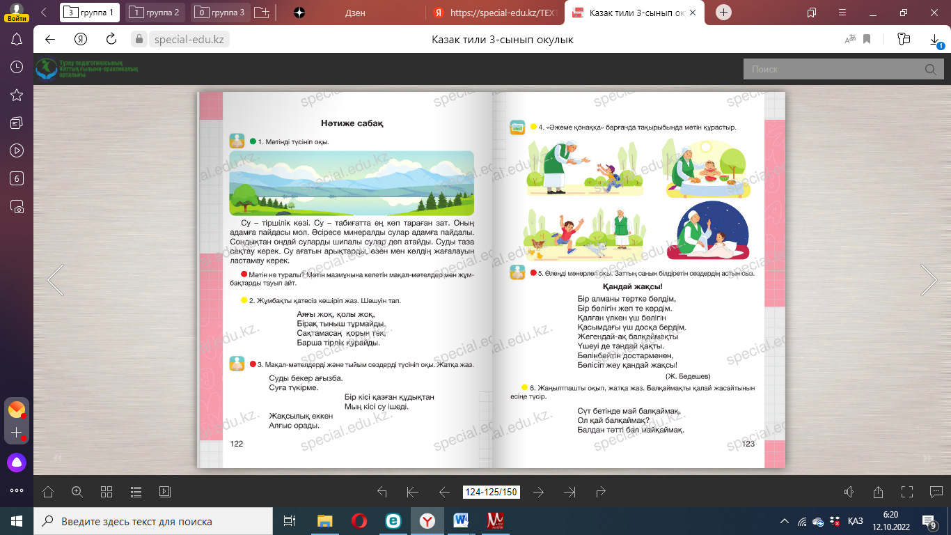 Дескриптор: 1 .Оқығандарының диалог екенін дәлелдейді; 2. Диалогті көшіріп жазады; Кері байланыс: «Житондар» ҚБ « Жұлдызшалар» Сергіту сәті Айналайын торпақ, бола берме қорқақ , Айналайын қозым, малда жуас бозым. Айналайын ботам, қандай күлте жотаң , Жалт-жұлт етіп лаң, жағалайсың бұл аң. (Қимылмен көрсетеді). Дәптермен жұмыс 7. Мәтінді оқы. Тақырып қой. Айран асқорыту жүйесін қалпына келтіруге көмектеседі. Алма шырыны бүйрек пен бауыр қызметіне жақсы әсер етеді. Әрі алма шырыны денсаулыққа пайдалы дәрумендерге бай. Қымыз – шипалы сусын. ____________________________________________________________ 8. Дастарқан мәдениетіне қатысты сөйлемдерді оқы. Есіңе сақтап көшіріп жаз. Қолды жумай тамақ жеуге отырма. Тамақты асықпай іш. Тамақ ішкен соң тұрып кетуге болмайды. Өйткені тамақтан соң ас қайырылып, бата беріледі. Үй иесіне жақсы тілек ай- тылады. ____________________________________________________________ ____________________________________________________________ Дескриптор: 1.Сөздегі сөйлем тобын анықтайды; 2. Сөйлемдерді көшіріп жазады; 3. Сөйлемдегі негізгі ойды анықтайды; Кері байланыс: «Житондар» ҚБ «Жұлдызшалар» |