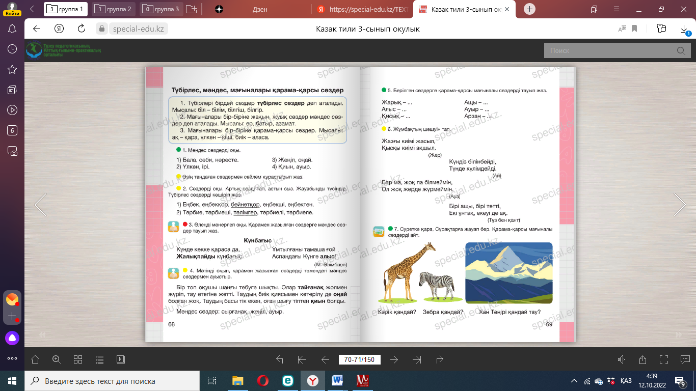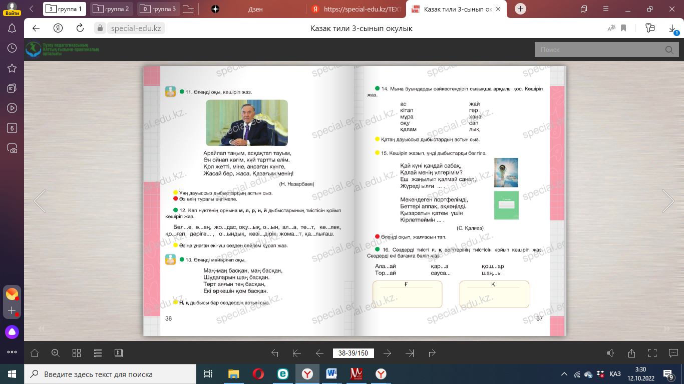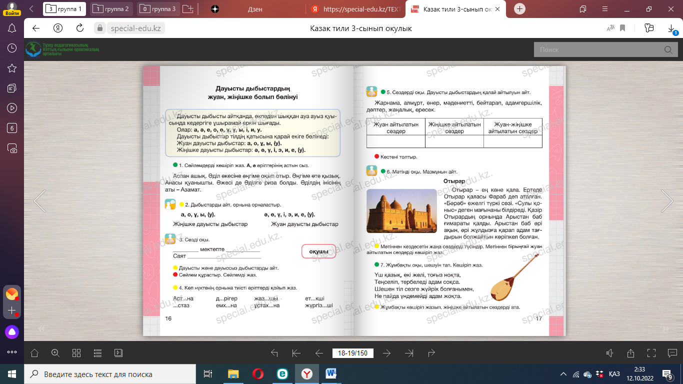-Отырар туралы тағы не білесің? Дескриптор: - Кестедегі сөздерді салыстырады. - Мәтінді оқып, сұраққа жауап береді. -Мәтінге ат қояды.. Сергіту сәті: Оңға, оңға түзу тұр, Солға, солға түзу тұр. Артқа қарай бір адым Алдыға қарай бір адым Жоғары төмен қарайық Орнымызды табайық. Дәптермен жұмыс Дауысты дыбыстардың жуан, жіңішке бөлінуі 1. Сөздерді буынға бөліп жаз. Жуан дауыстылардың астын бір сызықпен, жіңішке дауысты- лардың астын екі сызықпен сызып белгіле. Бала, ата, сәби, әке, ана, сіңлі, қарындас, іні, әже, аға, нағашы, жиен, дос. ____________________________________________________________ 2. Өлеңді оқы. Өлеңдегі дауысты дыбыстарды көшіріп жаз. Өлеңдегі дауысты дыбыстарды ғана әндетіп оқы. Әрқашан Күн сөнбесін! Аспаннан бұлт төнбесін! Қасымда болсын анам, Болайын мен де аман! (Л. Ошанин) ____________________________________________________________ 3. Сөздерді оқы. Бірыңғай жуан дауысты дыбыстары бар туыстық қатынастарды білдіретін сөздерді теріп жаз. Ата, шам, әке, әпке, нағашы, үстел, жеңге, ұшақ, бөле, жиен, жез, құндыз, іні, қарындас, құрдас, сыйлы, қонақ, қарлығыш, көрші, жыршы. ____________________________________________________________ - Сөйлемдерді көшіріп жазады. -Сұрақтарға жауап береді. |