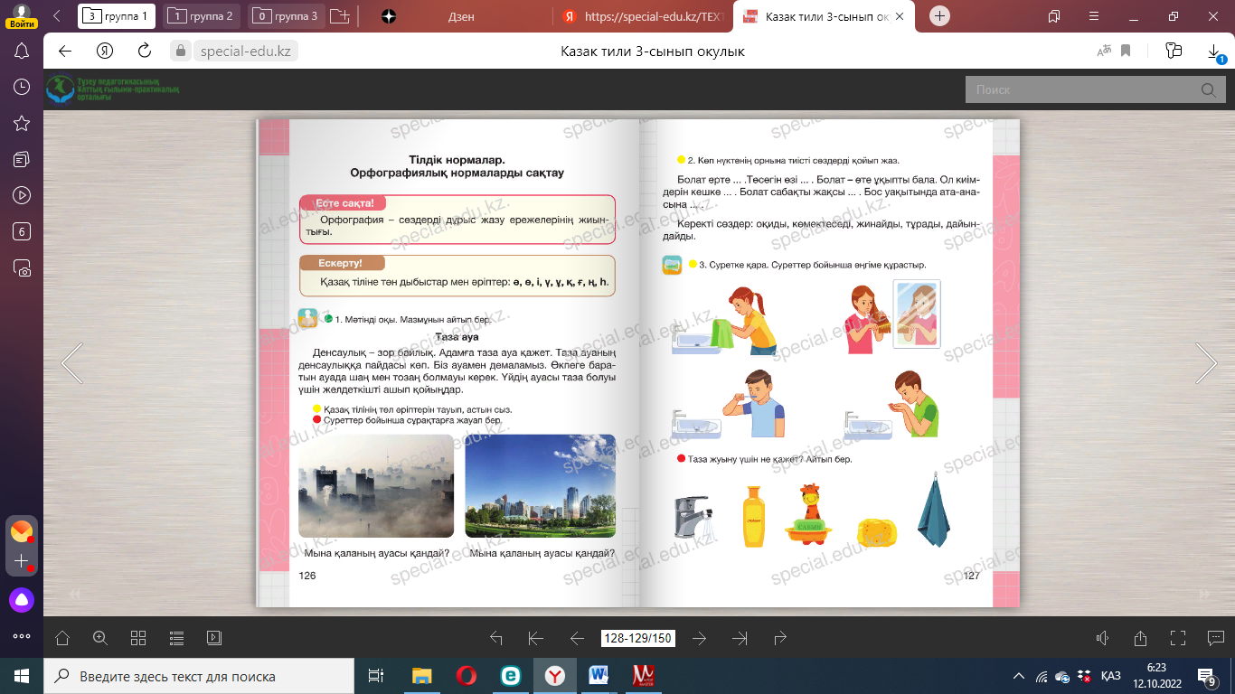 тұр Дәптермен жұмыс Тілдік нормалар. Орфографиялық нормаларды сақтау 1. Мәтінді оқы. Қарамен жазылған сөздерді буынға бөліп жаз. Бүгінгі таң күндегідей болған жоқ. Малын сауып, дастарқа- нын жайып қойған соң, әжесі немересінің бөлмесіне кірді. Кірсе, бала кереуетінде жатыр екен. Әлдеқашан оянып алыпты. – Әже, мен ояндым, – деді еркелей сөйлеп. – Жарайсың, құлыным. Өздігіңнен оянсаң – жігіт болғаның. Енді тұрып, салқын сумен жуынып кел. Сонан соң екеуміз таңғы асымызды ішейік. («Балапан» журналынан.) ____________________________________________________________ ____________________________________________________________ ____________________________________________________________ 2. Мәтінді оқы. Көп нүктенің орнына тиісті әріпті қойып көшіріп жаз. Адам ағзасында көптеген микр...бтар болатынын білесің бе? Олар тіске жабысқан т...тті тағамдардың қалдықтарымен қ...ректеніп, тістің бүлінуіне, шіруіне әкеледі. Үнемі тіс д...рі- геріне қаралған жөн. ____________________________________________________________ 3. Жаңылтпашты тез айтып жаттық! Жатқа жаз. Доп теп, Дөп теп, Көп теп. |
