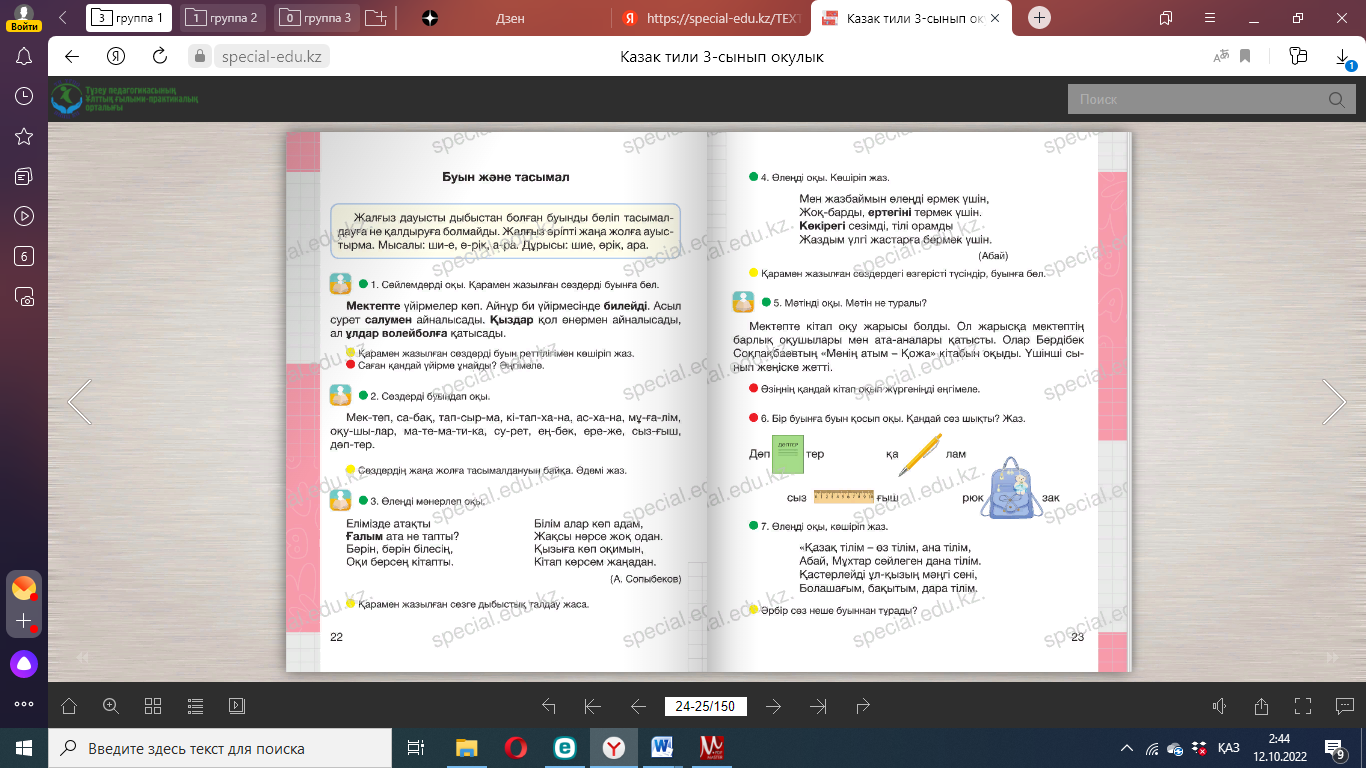 3.1.4.2. буындардың құрамы әртүрлі сөздерді буынға бөлу, санын, кезектілігін анықтау. Буын ережелерін түсіну |