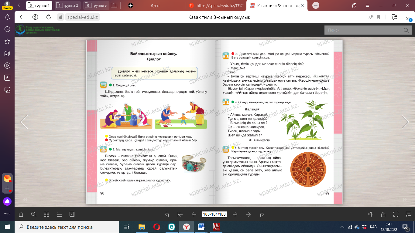 1. Диалогті дұрыс қалпына келтіріп жазады; 2. Диалогтың ережесін есіне түсіреді; Кері байланыс: «Житондар» ҚБ « Жұлдызшалар» Сергіту сәті