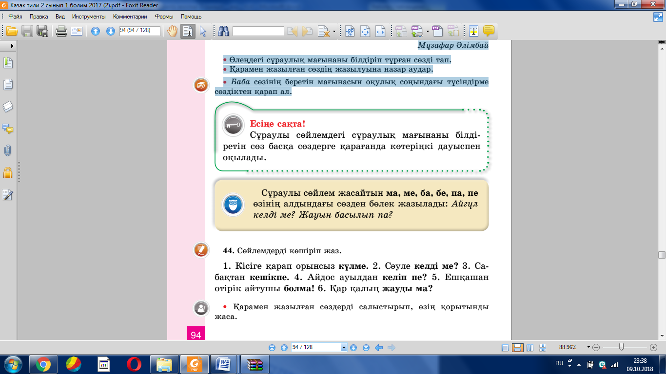 - Сөйлемдерді көшіріп жазады. -Сұрақтарға жауап береді.
