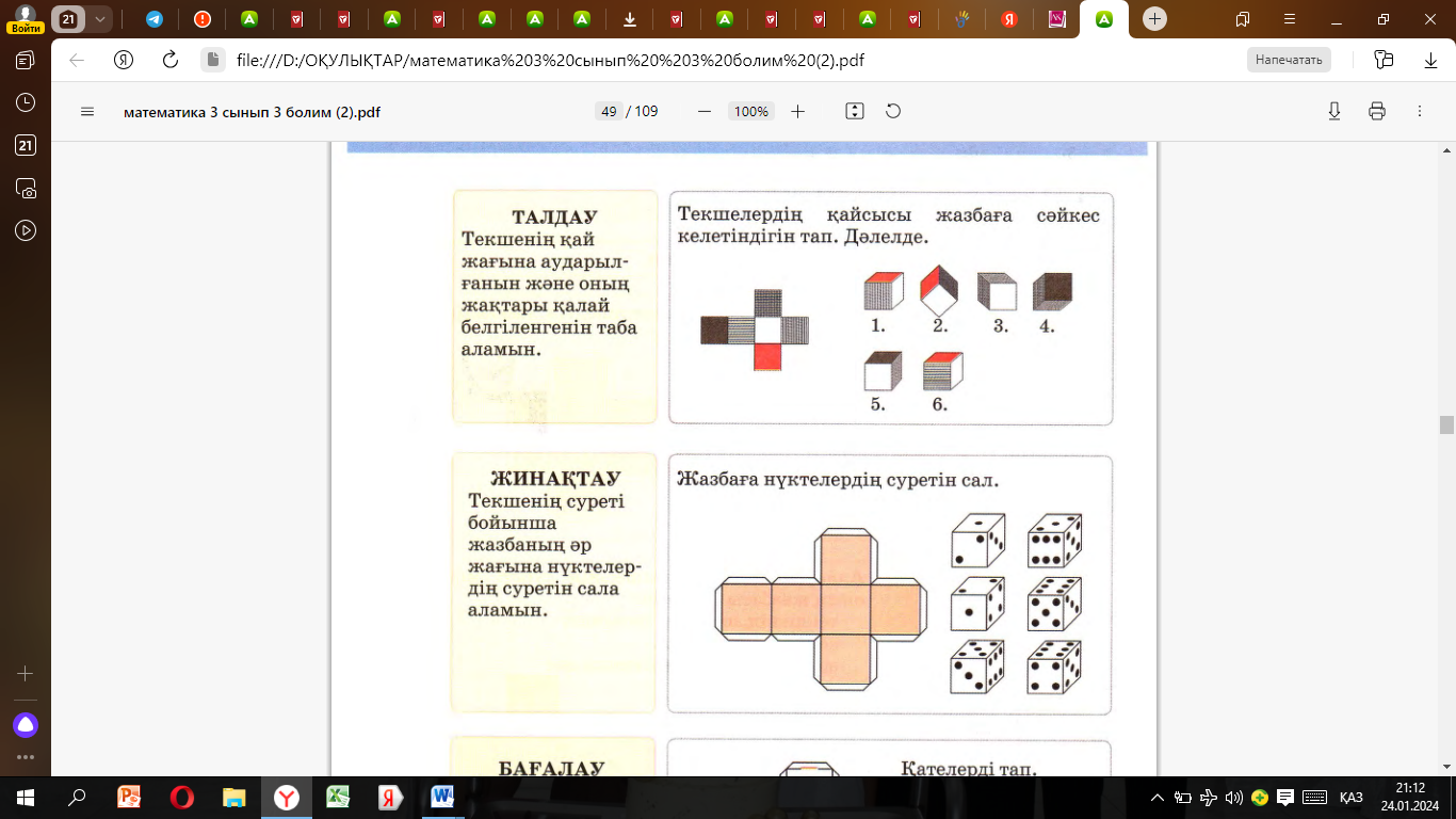 1-тапсырм Ұжымдық жұмыс «Біліміңді қолдан» әдісі Ойын текшесінің суреті мен оның жазбасы берілген -текшенің астыңғы жағында -сол бүйір жағында -артқы бүйір жағында қанша дөңгелек бар? ЕББҚ Тапсырманы орындауда қолдау көрсету Талқылау сұрақтары: Тапсырмадан не үйрендің? |