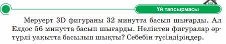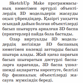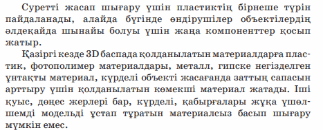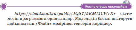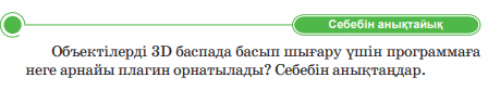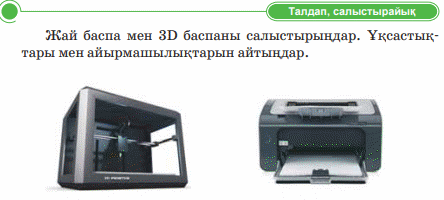 Дескриптор: Жай баспа мен 3D салыстырады 2 балл Дескриптор: - 3d баспада басып шығару үшін программаға не үшін плагин орнатылатыны айтады 2 балл Дескриптор: Сұраққа жауап береді Дескриптор: Модельдің басып шығаруға дайындаған «файл» мәзірін тексеріп көреді 2 бал Дескриптор: -онлайн платформада сұрақтарға жауап береді 2 балл |