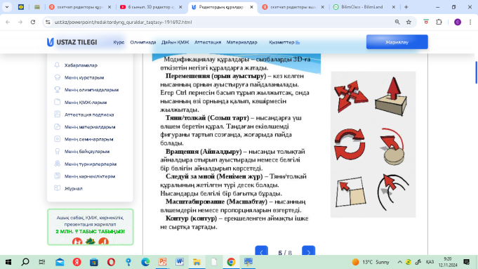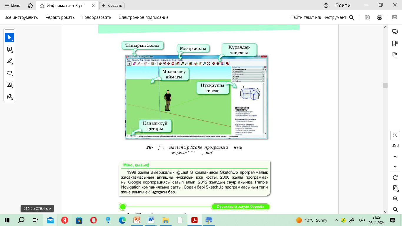 SketchUp программасында пайдаланылатын негізгі құралдармен танысады QR тапсырмаларын орындайды «Киндер» моделін құрастырып сәйкестендіру жүргізеді. Сұраққа жауап береді |