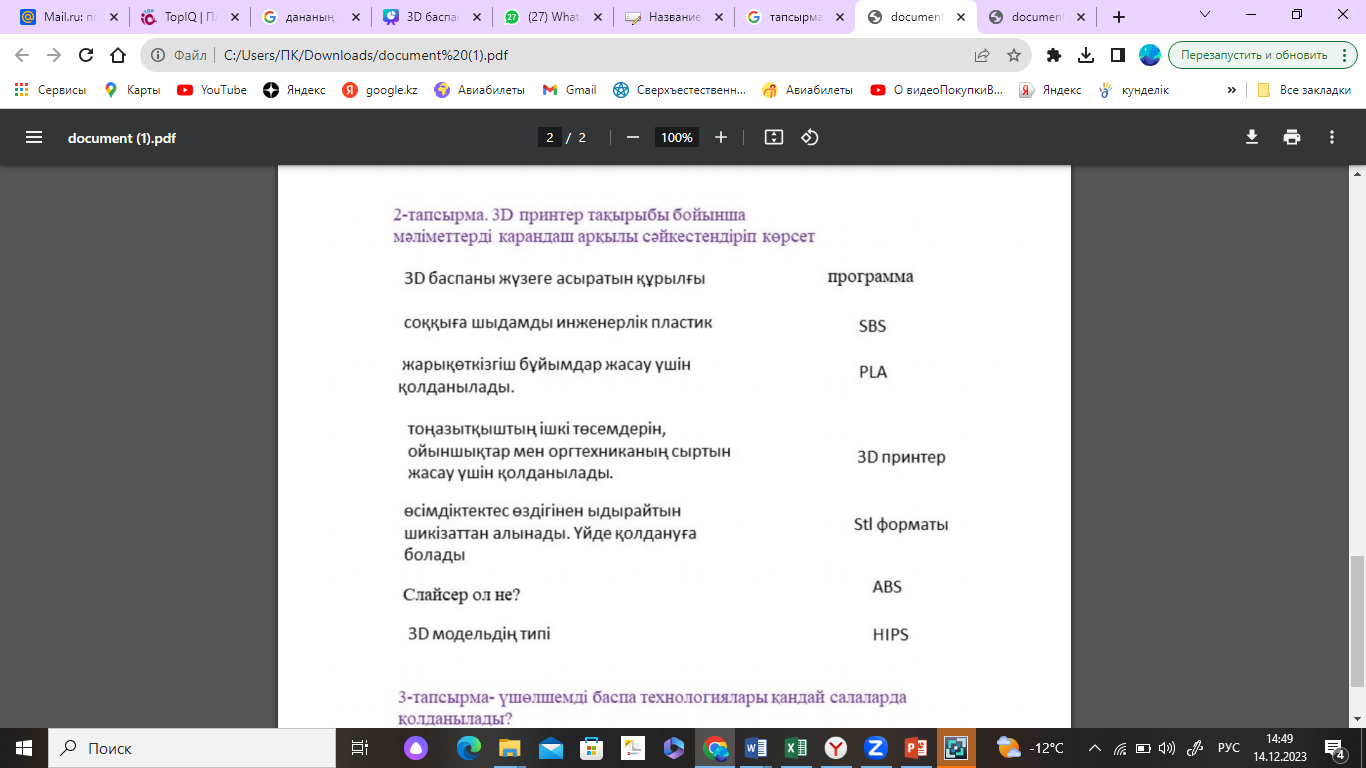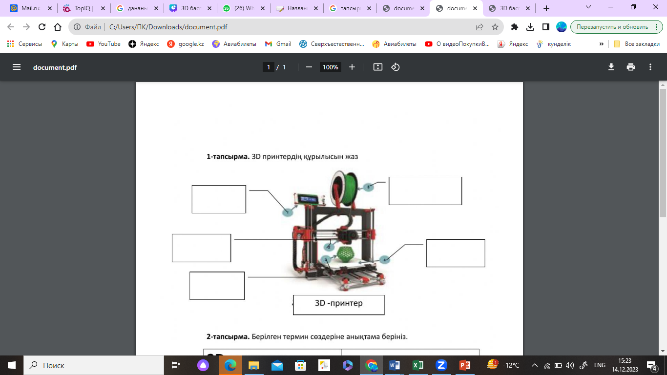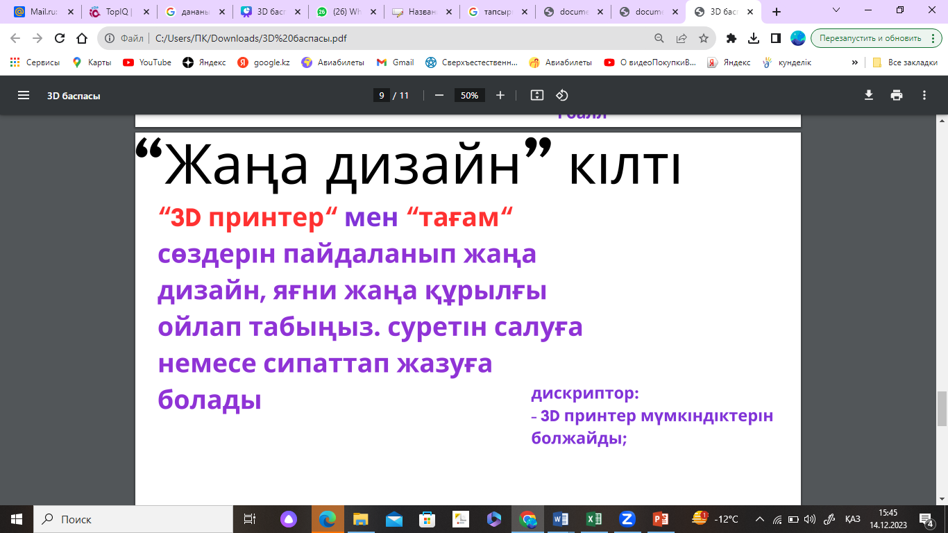 3D баспа құрылғысымен танысады; 3D құрылғысының жұмыс принципін түсінеді;