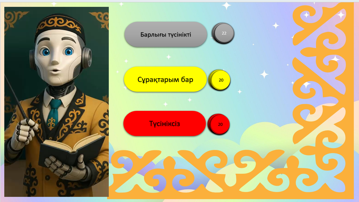 Мэмді қайталайды. Көңіл-күйлері көтеріліп, жақсы көңіл-күймен сабақты бастайды Сұрақтарға жауап береді |
