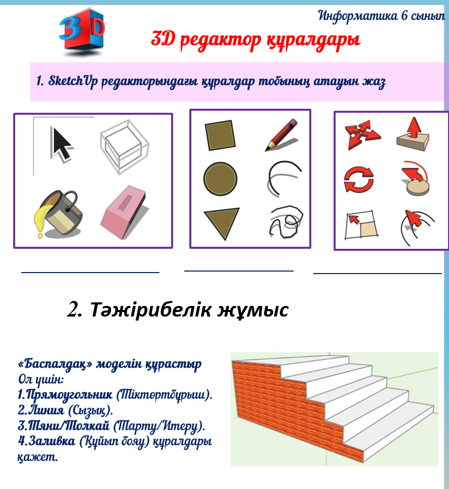 Бағалау критерийі: 3D формаларын құру және өзгерту үшін қолданылатын SketchUp құралдарының мақсатын анықтайды және сипаттайды Дескрипторлар: - құралдың атауын біледі. – құралдың қызметін түсіндіреді.