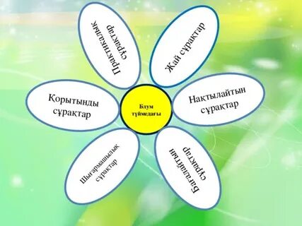 5-тапсырма «Радио» әдісі Балалық шақтың қадірі туралы ақын сөзіне зер сала тыңда. «Балалық шақ» өлеңі. Авторы: М. Жұмабаев 6-тапсырма Түсініп оқы. Өлеңнің авторы туралы әңгімеле. Мағжан Жұмабаев (1893–1938) Солтүстік Қазақстан облысы қазіргі Мағжан Жұмабаев ауданында туған. Өлеңдерімен қазақ жастарын оқуға, білімге, өнерлі болуға шақырған. Топтық жұмыс 7-тапсырма «Топтастыру» әдісі Өлеңде ақын не туралы айтқан? Нені өсиет етеді? Постер құр. ҚЖ: «Блум түймедағы» әдісі бойынша сұрақтарға жауап береді. Блум түймедағының алты күлтесі- сұрақтар типінің алты түрі 1. Қарапайым сұрақтар. Өлеңнің авторы кім? 2. Анықтауыш сұрақтар. Өлеңде не туралы айтылған? 3. Интерпретациялық сұрақтар. «Үйрен білім жастықта» дегенді қалай түсінесің? 4. Шығармашылық сұрақтар. Өз балалық шағыңды қалай өткізіп жатырсың? 5. Бағалау сұрақтары. Өлең арқылы автор неге шақырады? 6. Тәжірибелік сұрақтар. Өлеңге басқаша кандай тақырып қоюға болады? Үй тапсырмасы Ертегі мен өлеңді оқып, әңгімелеу Кері байланыс