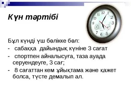 Үй тапсырмасы «Күн тәртібі» мәтінін түсініп оқып, мазмұнын айт ҚЖ: ФС тапсырмасы Осы сабақта оқыған мәтінің бойынша ойыңды төрт сөйлеммен жаз. Айтылған пікір қайталанбауы керек, дәлелмен жаз. Ойыңды тұжырымдап, нақты жеткіз. Бірінші сөйлем: «Менің ойымша, ... ». Екінші сөйлем: «Себебі мен оны түсінемін ... ». Үшінші сөйлем: «Оны мен мына фактілермен, мысал- дармен дәлелдей аламын ... ». Соңғы сөйлем: «Осыған байланысты мен мынадай қорытынды шешімге келдім ... ». Кері байланыс