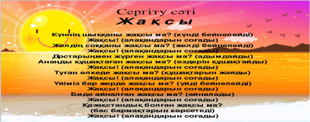Сабақ тың басы 5 минут Өткенді пысықтау 5 минут Сабақ тың ортасы 20 минут Сергіту сәті 2 минут Сабақты қорыту 6минут Қосымша тапсырма 2минут Кері байланыс 5 минут |