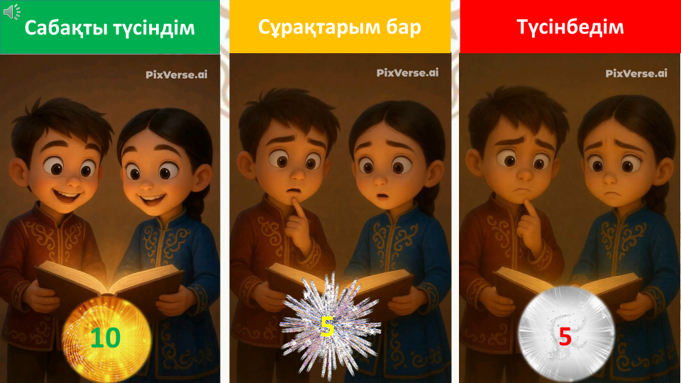 4.1.4.2 сөйлеу барысында иллюстрациялар, көрнекіліктер, фотосуреттер қолдану, презентация, видеоролик жасау 4.2.6.1 кейіпкердің, кейіпкерлердің іс-әрекеті, мінез-құлқының өзгеру себептерін мәтіннен тауып, салыстырып бағалау 4.3.4.1 мұғалімнің көмегімен шығарманың құрылымын, стилін жетілдіру, өз бетінше сын тұрғысынан бағалау және лексикалық, орфографиялық, пунктуациялық қателерді тауып түзету |