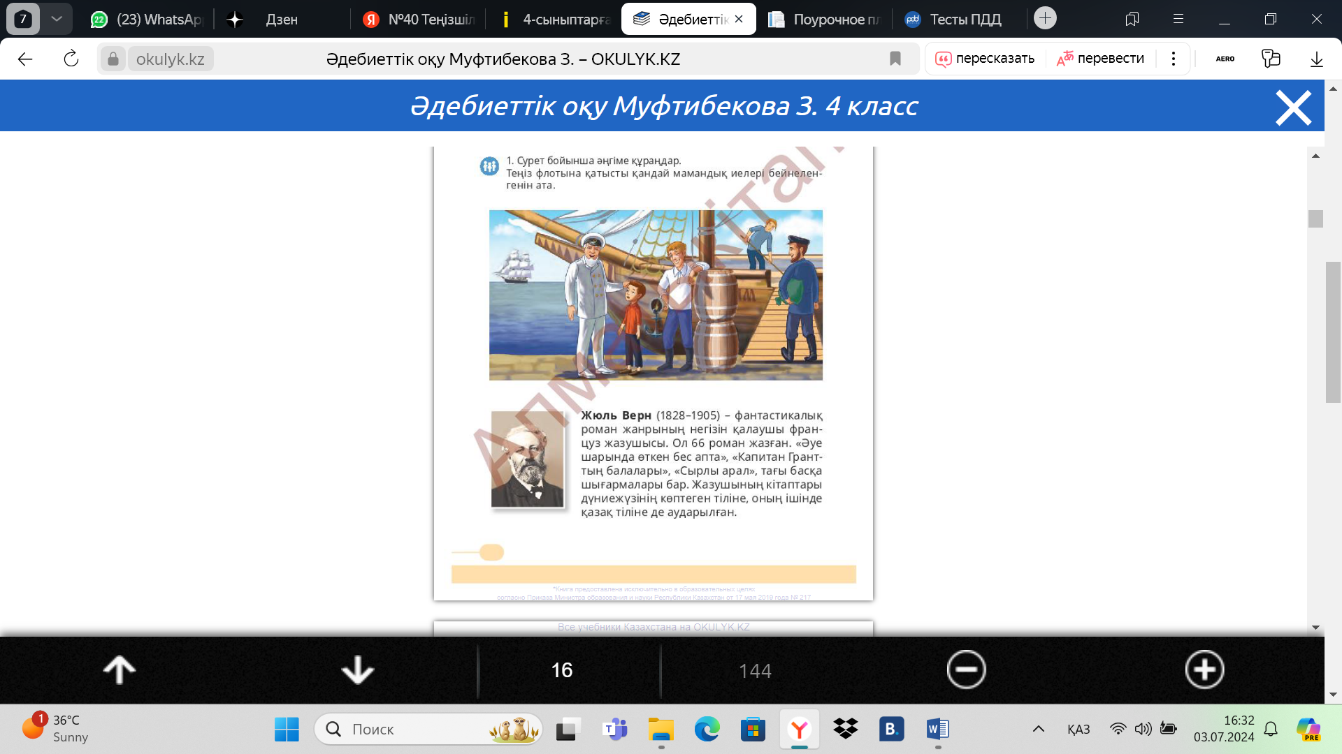Сабақты бекіту. Сұрақ-жауап арқылы бекіту. -Теңізші кәсібі туралы қандай жаңа ақпарат алдыңдар? -Өзіңе ұнайтын кәсіп жөнінде не білгің келеді? Үйге тапсырма.Оқу.16-18-беттер Суреттегі мамандық иелерін, заттарды сипаттап жаз. Рефлексия
