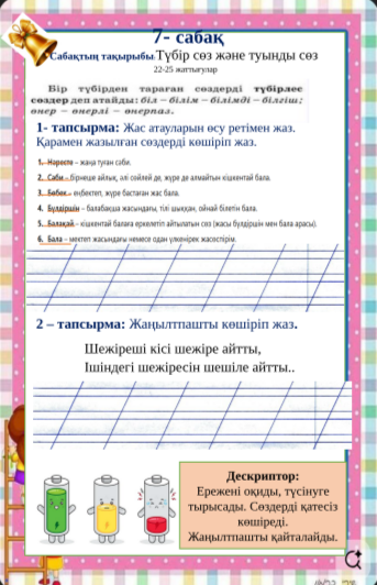 Дескриптор: 1-топ. Түбірлес сөздерді табады. 2-топ. Негізгі түбірге жұрнақ жалғап, туынды сөз жасайды 3-топ. Түбірлес сөздерді сәйкестендіреді 3 балл
