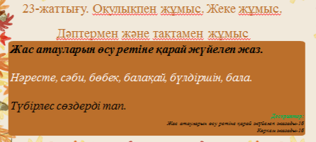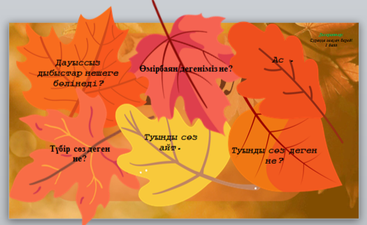 Ынтымақтастық атмосферасын қалыптастыру «Гауһар тастар» «Адал азамат» тәрбие бағдарламасындағы құндылықтарды оқу процесіне ұйымдастыру кезіңінен бастап, сабақтың әрбір кезеңінде жүргіземін. Құндылық: Қазан айы Әділдік пен жауапкершілік айы; Жақсылыққа игілікке бой түзеу, абыройлы болуға, жауапкершілік, мейірімділік, қамқорлық, әділдік қасиеттерін жоғары бағалау және құқықтық тәрбиені қалыптастыру диалогын жасаймыз Топтарға бөлу. Құндылықтарға байланысты топ атауларын анықтау. «Шар жару» әдісі 3 топтан бір-бір оқушы шығып шарды жарады. Ішінен сөз шығады, сол бойынша топтарының атауларын анықтайды. 1. «Мейірім» тобы 2. «Қамқорлық» тобы 3. «Жақсылық» тобы Өткен тақырыпқа шолу және жаңа тақырыпты ашу: А) Үйге берілген оқу тапсырмасы: 21-жаттығу. Бір дыбыс екі рет қайталанбайтындай етіп жаңа сөз жасап жаз. Ә) «Күзгі жапырақтар» әдісі арқылы өткен сабақты пысықтау. Сабақтың тақырыбын анықтау 1. Түбір сөз деген не? 2. Туынды сөз деген не? 3. Дауыссыз дыбыстар нешеге бөлінеді? 4. Өмірбаян дегеніміз не? 5. Берілген түбір сөзге жұрнақ жалғап туынды сөз жасаңдар және берілген жұрнақтарға сай келетін түбір сөзді тауып жазыңдар. 6. Туынды сөз айт.