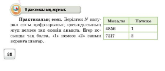 k=N%10 – сандардың жұп екенін анықтау; s+=k – жұп сандардың қосындысын анықтау; s%2=1- сандардың қосындысының тақ екенін анықтау Дескриптор -while циклінің қызметін анықтайды; - сандардың жұп немесе тақ екенін тексеру операторларын анықтайды.