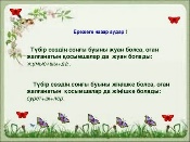 Өткенді пысықтау Үй тапсырмасы 29-жаттығу Сұрақтарға жауап жаз. 1. Күн мен түн теңелетін кез? 2. Ең ұзақ күн қашан болады? 3. Ең ұзақ түн қашан болады? 4. 365 күн неше жылға тең? Жаңа тақырып 30-жаттығу ФС тапсырмасы «Допты қағып ал» ойыны Мәтінді тыңда. Жоғалтып алған күн • Мәтін неліктен «Жоғалтып алған күн» деп аталған? Өз ойыңмен бөліс. Ж: Пайдалы іс жасамаған күн-жоғалтқан күн деп есептеледі «Егер бір күннің ішінде пайдалы жұмыс бітірмесең, онда бұл күніңді босқа өткіздім деп есептей бер» нақыл сөзінің мәнін топта талқыла. Мәтіндегі қарамен жазылған сөздерге назар аудар. Түбір сөздерге қосымшалардың жуан, жіңішке болып жалғану себебі неде деп ойлайсың? Ереже Түбір сөздің соңғы буыны жуан болса, оған жалғанатын қосымшалар да жуан болады: адам+дар+дың. Түбір сөздің соңғы буыны жіңішке болса, оған жалғанатын қосымшалар да жіңішке болады: сурет+ші+лер. ЕБҚ Жуан және жіңішке қосымшалары бар сөздерге мысал келтір Ж: Ұстаздар, мектепте..... 31-жаттығу. Көп нүктенің орнына тиісті сөздерді қойып, сөйлем құрап жаз. Уақыт жылжиды. Сағат жүреді. Уақыт тез өтеді. Сергіту сәті