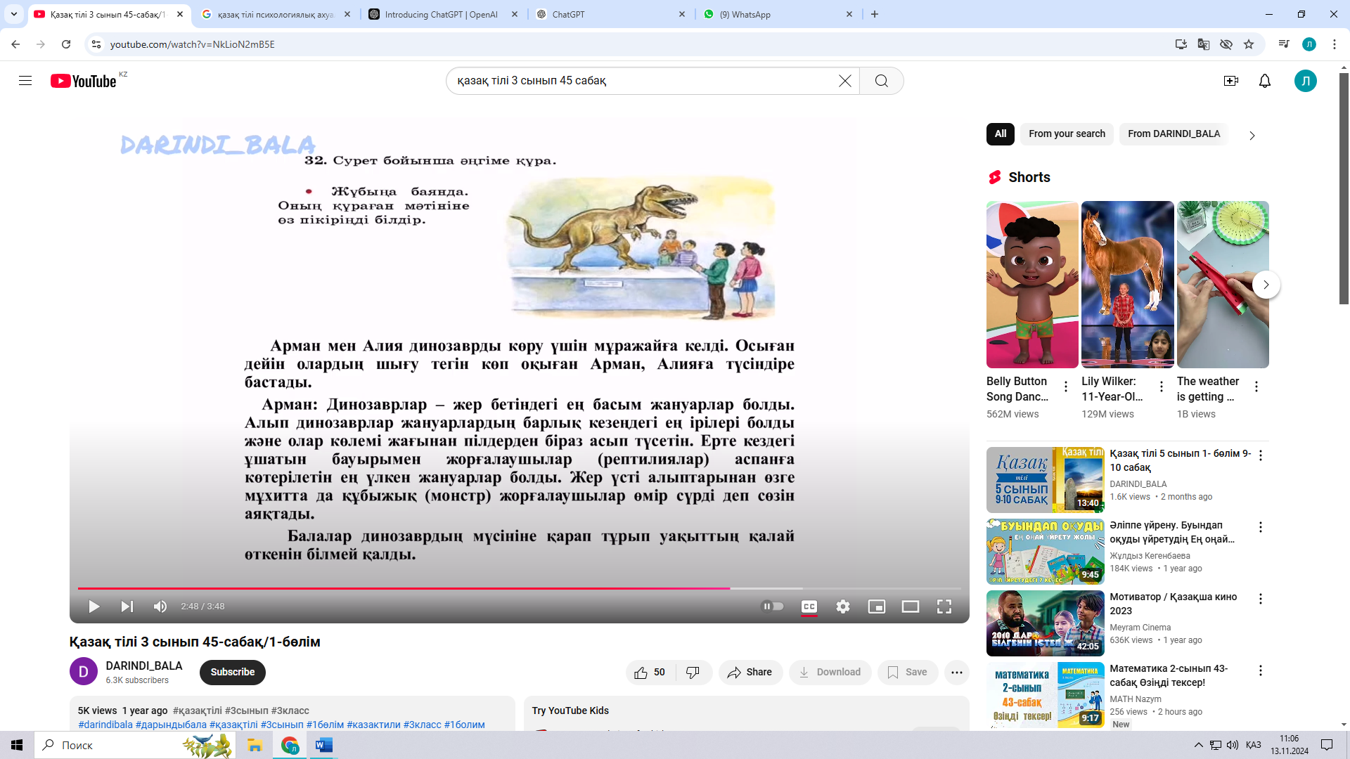 32 – жаттығу Арман мен Алия динозаврды көру үшін мұражайға келді. Осыған дейін олардың шығу тегін көп оқыған Арман, Алияға түсіндіре бастады. Арман: Динозврлар – жер бетіндегі ең басым жануарлар болды. Алып динозврлар жануарлардың барлық кезеңдегі ең ірілері болды және олар көлемі жағынан пілдерден біраз асып түсетін. Ерте кездегі ұшатын бауырман жорғалаушылар ( рептилиялар ) аспанға көтерілетін ең үлкен жануарлар болды. Жер үсті алыптарынан өзге мұхитта да құбыжық (монстр ) жорғалаушылар өмір сүрді деп сөзін аяқтады. Балалар динозаврдың мүсініне қарап тұрып уақыттың қалай өткенін білмей қалды. |