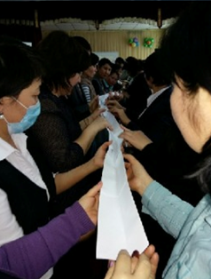 Оқушылар парақты алып, ортасынан екіге бүктеп, бір-біріне жанастырып құбыр жасайды. Оқушылар қол көтеру арқылы жауап береді. |