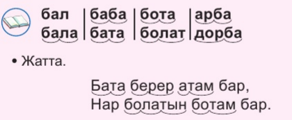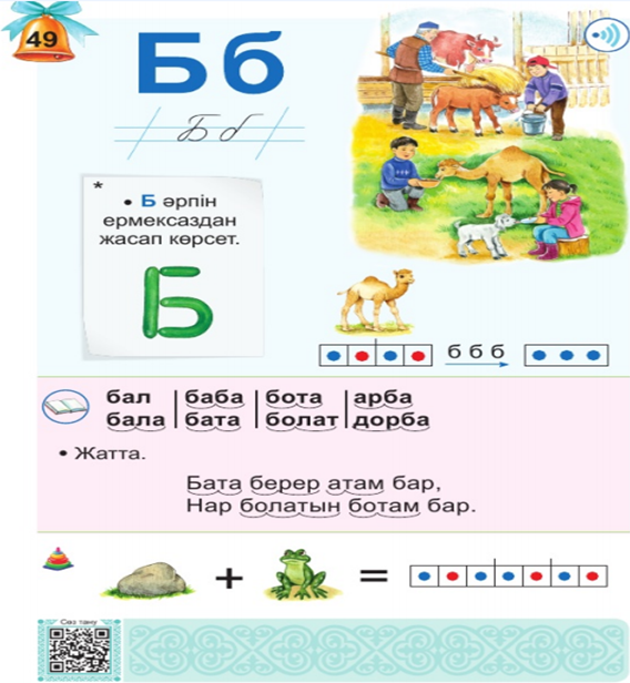 - Әр беттің соңында берілген дөңгелек- шартты белгілерді тапсырманы орындауларыңа қарай бояңдар. «жасыл» түс – «Жарайсың!», «көк» түс –«Жақсы!» «қызыл» түс –«Талпын!». (Ұ) 4- тапсырма - «Сөз тану» айдары. QR кодта берілген мақалдың мәнін «Ақылды бала айтқызбай істейді» Түсіндіру ЕББҚ оқушыға: - Б дыбысы бар буын құрап айтады ЕБҚ оқушыға: Б дыбысы бар сөзді қатыстырып сөйлем құрап айт. ҚБ тапсырма: |