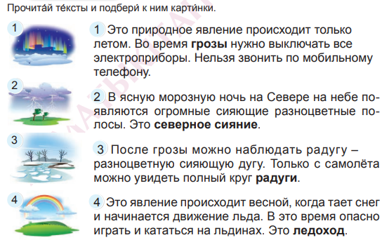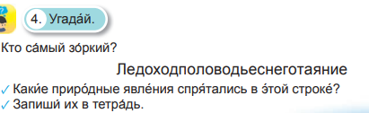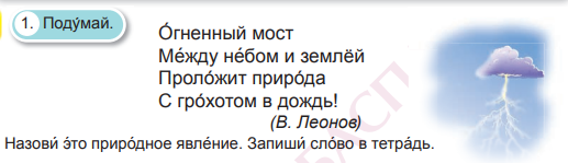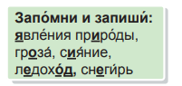 Рассмотри́вают кла́ стер и называют знако́мые явле́ ния приро́ ды. Записывают В како́ е вре́ мя го́ да они́ происхо́ дят?