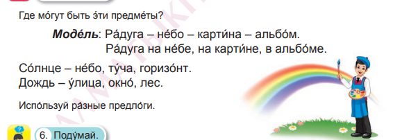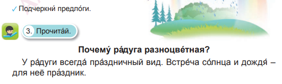 Назови слова с предлогами. Вспомни, как пишутся предлоги со словами. Какой вид у радуги? Почему?Куда прячется солнце, когда идет дождь? Когда дождевые капли и солнечные лучи смешиваются?Почему их не узнать? Что появляется на небе после дождя?Чему она радуется? Найди и выпиши слова с предлогами. Работа с предложениями.Учитель предлагает