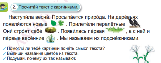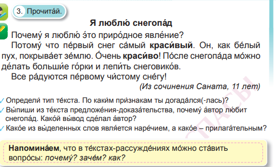 Отвечают на вопросы: О чём рассказа́ л Ро́ бик Сана́ ту? ✓ Испо́ льзуя вы́деленные слова́ в те́ ксте, расскажи́ , как меня́ ется приро́ да зимо́ й. ✓ Вы́пиши вы́деленные слова́ и определи́ их число́