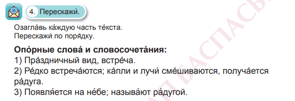 Учитель предлагает посмотреть обучающее видео «Почему появляется радуга?» и ответить на вопросы. Когда на небе появляется радуга? Что такое вторичная радуга Из каких цветов она состоит? Видел ли ты радугу? Опиши радугу Выразительное чтение текста 3