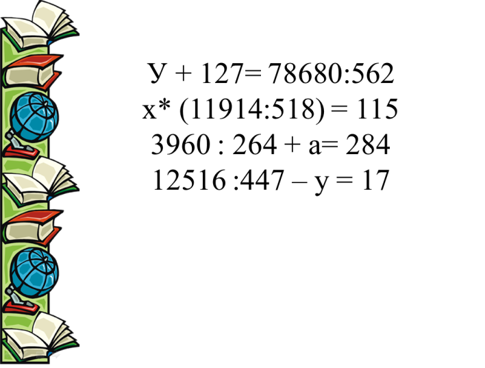 Деление, трехзначное число, задачи на движение, равенства и неравенства, сложные уравнения.