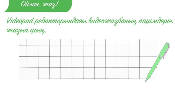 Оқушылар сұрақтарға жауап береді Дескриптор: - видиожазба терезесімен танысу; -VideoPad программасын орнату; - VideoPad программасында файлдарды жүктеу; -Видиожазбаны ойнату; Видиожазбаны тоқтату; Дескриптор: -оқушылар топпен бірлесе жұмыс істейді; -берілген батырманың анықтамасын дәптерлеріне жазады; Дескриптор: -оқушылар жұппен кестемен жұмыс істейді; -видеожазбаның пішімдерін жазады Дескриптор: -оқушылар интернеттен қыз қызығы тақырыбына видеожасайды; -видиожазбаға мәтін жазады. |