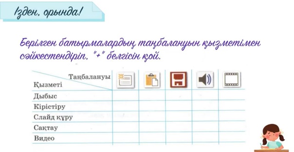 Дескриптор: -оқушылар топпен бірлесе жұмыс істейді; -берілген батырманың қызметін сәйкестендіреді; Дескриптор: -оқушылар жұппен кестемен жұмыс істейді; -берілген команданың қызметін жазады; Дескриптор: -оқушылар интернеттен қоршаған ортаны қорғау тақырыбына презентация жасайды; |
